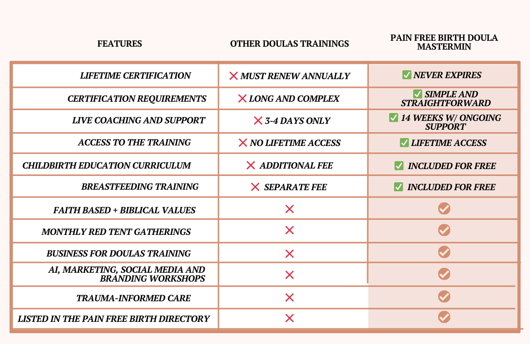 Introducing the Pain Free Birth Doula Mastermind: a 14 week doula training program with a proven system to take you from feeling frustrated, overwhelmed, and uncertain to becoming a confident, skilled, and impactful doula who’s transforming birth and building a thriving business.