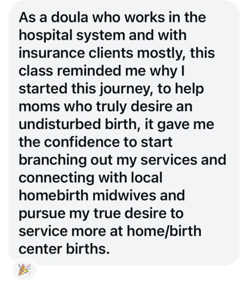 As a doula who works in the hospital system and with insurance clients mostly, this class reminded me why I started this journey, to help moms who truly desire an undisturbed birth, it gave me the confidence to start branching out my services and connecting with local homebirth midwives and pursue my true desire to service more at home/birth center births.