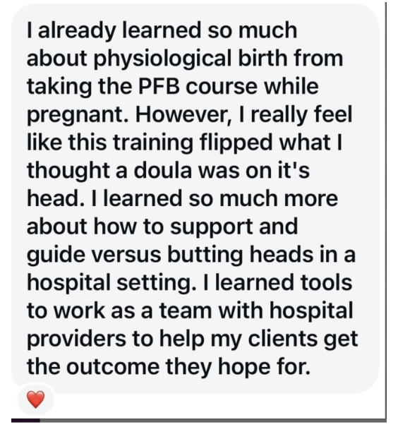 I feel like I learned a lot from this course. I already learned so much about physiological birth from taking the PFB class while pregnant. I really feel like this training flipped what I thought a doula was on it’s head. I learned so much more about how to support and guide versus butting heads in a hospital setting. I learned tools to work as a team with hospital providers to help my clients get the outcome they hope for.
